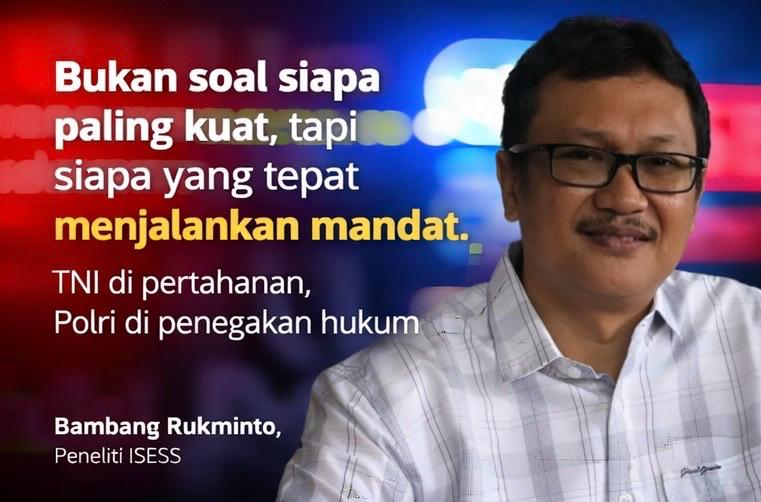 Bambang menilai terdapat perbedaan mendasar antara peran TNI dan Polri. TNI memiliki mandat utama di bidang pertahanan negara, sedangkan Polri menjalankan fungsi keamanan dan penegakan hukum. Dalam konteks terorisme yang selama ini diposisikan sebagai persoalan keamanan dan kriminalitas, pendekatan yang semestinya digunakan adalah penegakan hukum (law enforcement), bukan pendekatan militeristik.